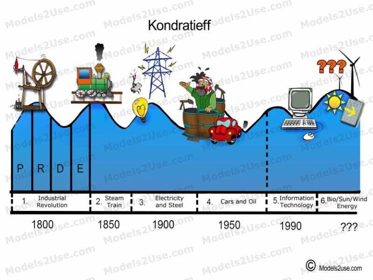 - Technologische Innovaties: Kondratieff verbond de lange golven met belangrijke technologische doorbraken die de economieën fundamenteel veranderen. Voorbeelden hiervan zijn de industriële revolutie, de ontwikkeling van spoorwegen, de opkomst van de auto-industrie en de verspreiding van digitale technologieën